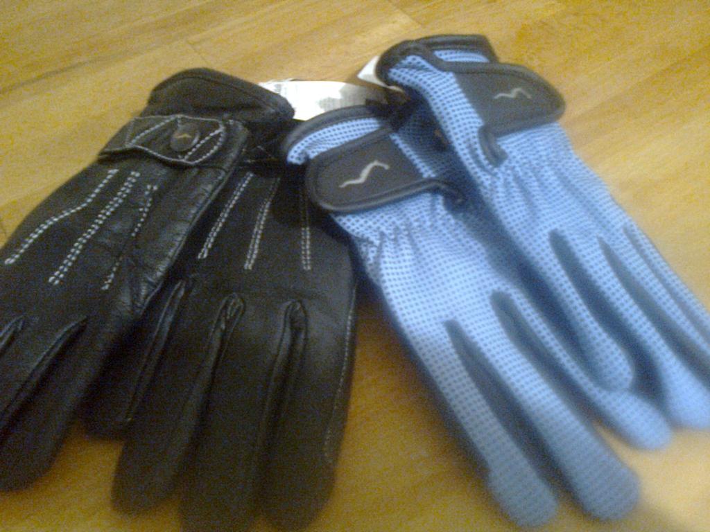 Kahdet ratsastushanskat, nahkaiset vuorella sekä sinimustat ohuet